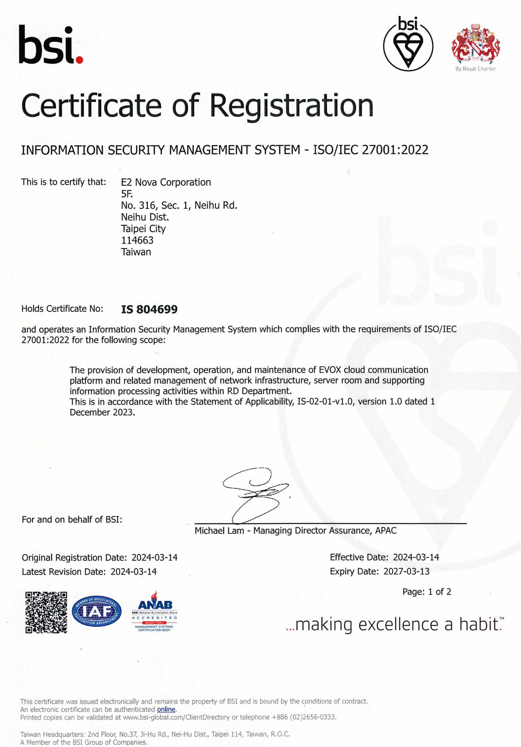 我們很高興宣布,本公司(易得雲端股份有限公司)已於2024年3月14日正式通過 ISO/IEC 27001:2022 資訊安全管理系統認證,這是易得雲端在資安領域的重大里程碑。ISO/IEC 27001:2022 是一項國際性標準,旨在幫助組織建立、實施、運行、監視、審查、維護和改進資訊安全管理系統。