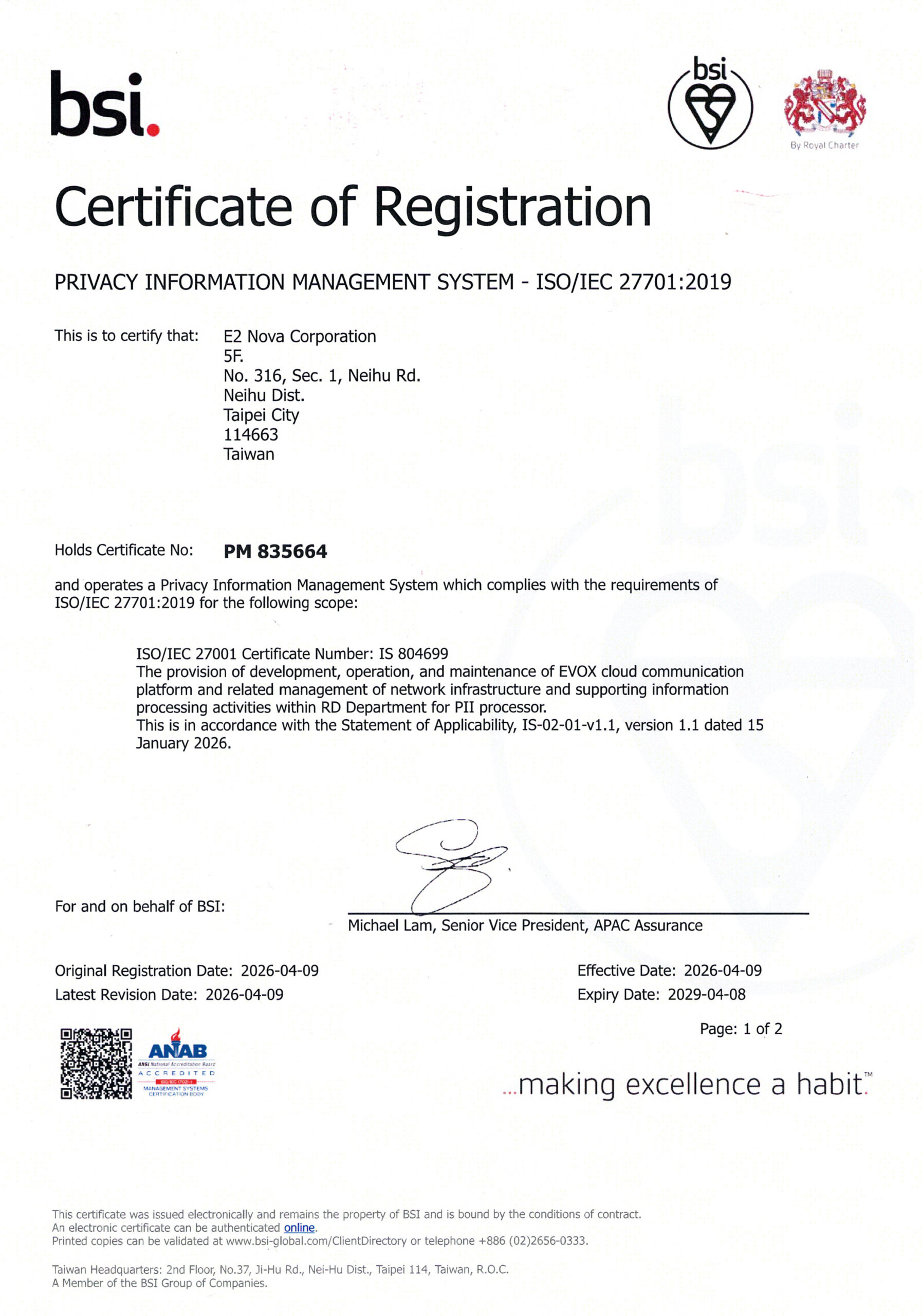 本公司(易得雲端股份有限公司)已於 2026 年 4 月 9 日正式通過 ISO/IEC 27701:2019 隱私資訊管理系統(PIMS)國際認證。這是易得雲端繼取得 ISO 27001 資訊安全認證後,在個人資料保護與隱私權管理領域的又一重大里程碑。