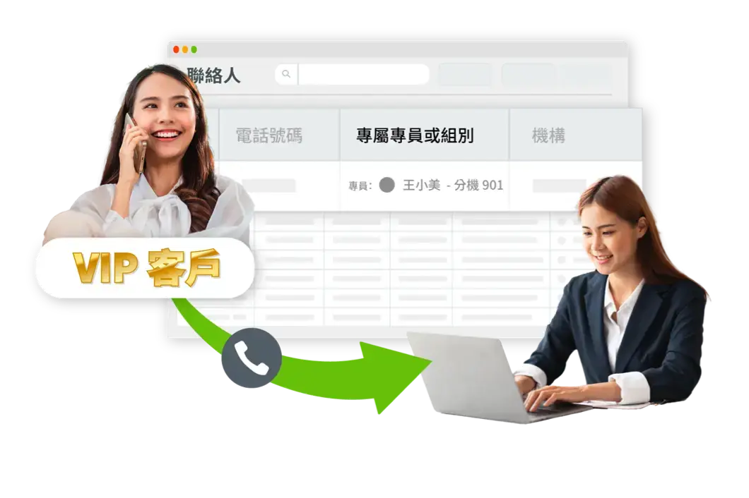 為 VIP 客戶設計專屬的來電分配機制,客戶不用記業務窗口的分機或直撥號碼,系統自動辨識來電者身分並略過總機語音,並直接分配給專屬的服務窗口,不僅節省時間,更讓客戶感受到專屬的禮遇。