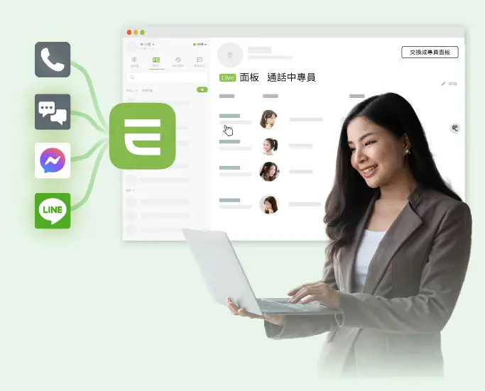 串聯電話、社群(LINE/FB/IG)與網頁通訊(Web Chat/Call),團隊只需在單一介面即可處理應對、查閱紀錄、指派轉接並進行分析。徹底解決跨平台切換的麻煩,確保商機與訊息零遺漏,讓服務效率與客戶體驗大幅提升。